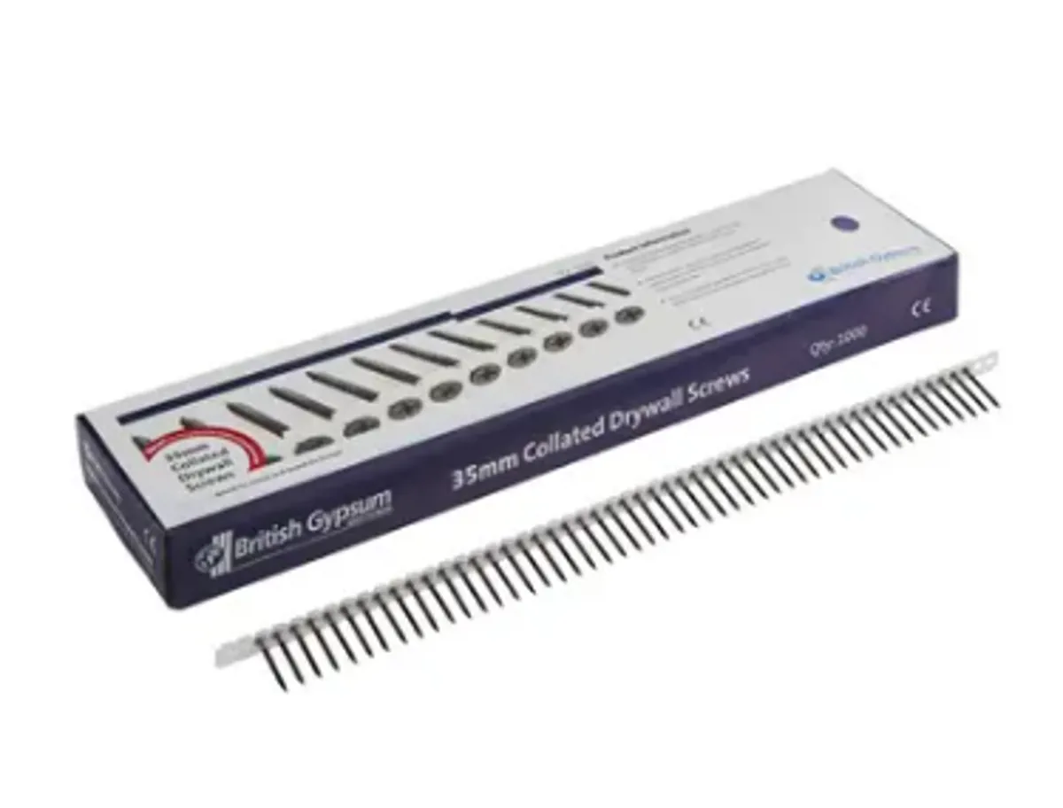 British Gypsum Collated Drywall Screws 35mm are phosphate-coated for corrosion resistance and have self-tapping points to help reliable and secure fixing of plasterboard linings to metal using an automatic screw gun.