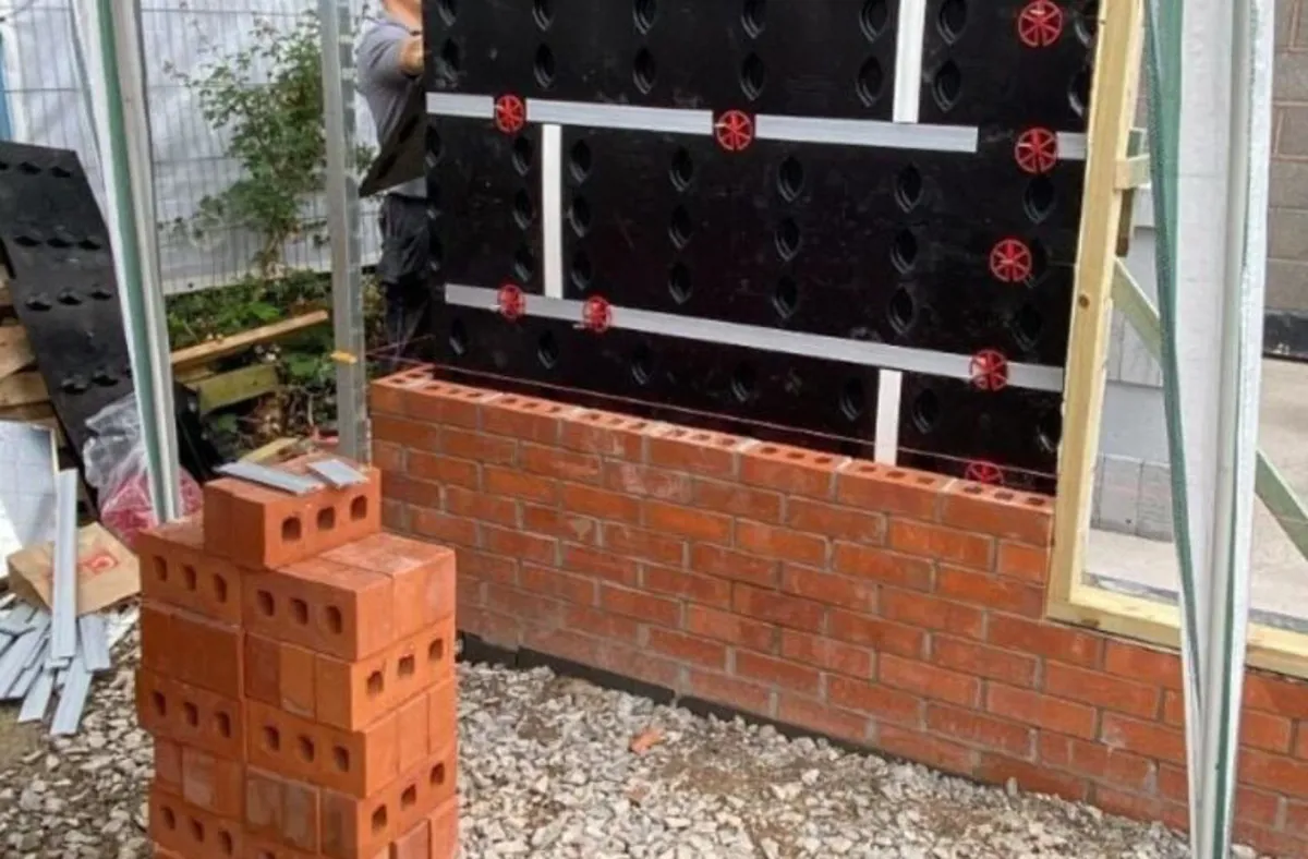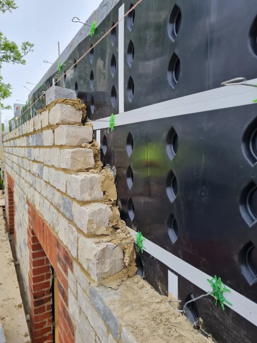 The SureCav25 protects against wind-driven rain, ensures a clear, moisture and mortar-free cavity, eliminating the risk of water ingress from dirty cavities. Can be used in any construction type, with any masonry finish. SureCav25 does away with the need of a concrete backing block behind your stonework, saving internal floor space reducing your wall width by 125mm!